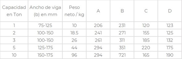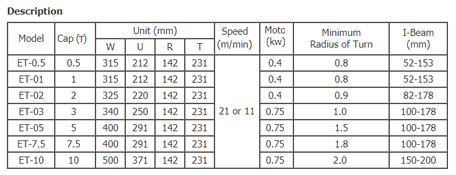 Variedad de trolleys eléctricos: el Trolley eléctrico normalizado, Diseñado para cumplir con las necesidades de carga pesada, esta serie está disponible en capacidades de 500 kg, 1 tonelada, 2 toneladas, 3 toneladas , 5 toneladas, 7.5 ton y 10 ton lo que le permite elegir el modelo que se adapte mejor a sus requisitos de manejo de materiales